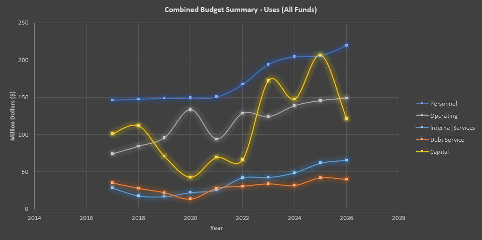 The costs of increasing staff size over the last 6 years as well as changes proposed for the 2026 budget can be seen in the Combined Budget Summary shown in Graph 2 and Table 4. This summary aggregates the costs of personnel, internal services, operating expenses, debt service and capital projects.