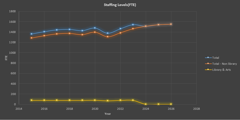 In 2024 the Library was spun off reducing staff by 78 FTE. Those positions were distributed to other departments and by 2025 the workforce was once again at 1539.