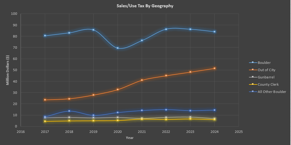 Data provided by the city [1] shows revenue by location. Graph 1 shows sales/use tax collections: